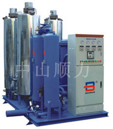 工作原理及产品特点 无论是催化脱氧还是化学脱氧,都需要氢气,可是有些地区缺少氢气来源,专门设置氨分解等制氢装置,生产环境又不允许或者用户不愿使用,因此,我们采用碳载纯化装置,在一定温度下,氮气中余氧与碳催化剂发生氧化(燃烧)反应,生成二氧化碳,在经净化装置除去二氧化碳及水份,经精密过滤器除去氮气中的杂质,得到高纯度氮气(99.9995%),其特点是要求定期添加碳脱氧剂和不需要使用氢气。 该系列装置工艺先进,稳定性好,氮气纯度高;本装置设有故障自动报警,?;δ埽缓康?,大气露点≤-60℃;脱氧器及加热器采用耐高温材制,安全可靠。
